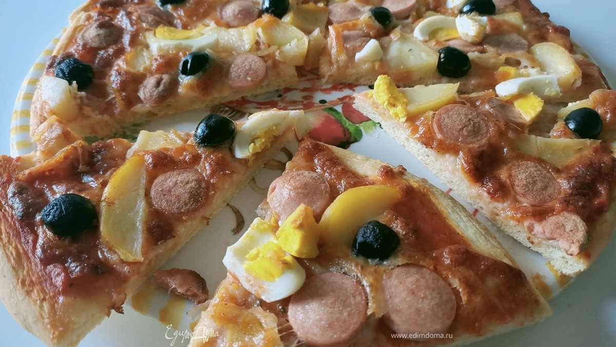 Томатная паста, приправа для пиццы, моцарелла, яйцо, сосиски, картошка и оливки. - Шаг 8