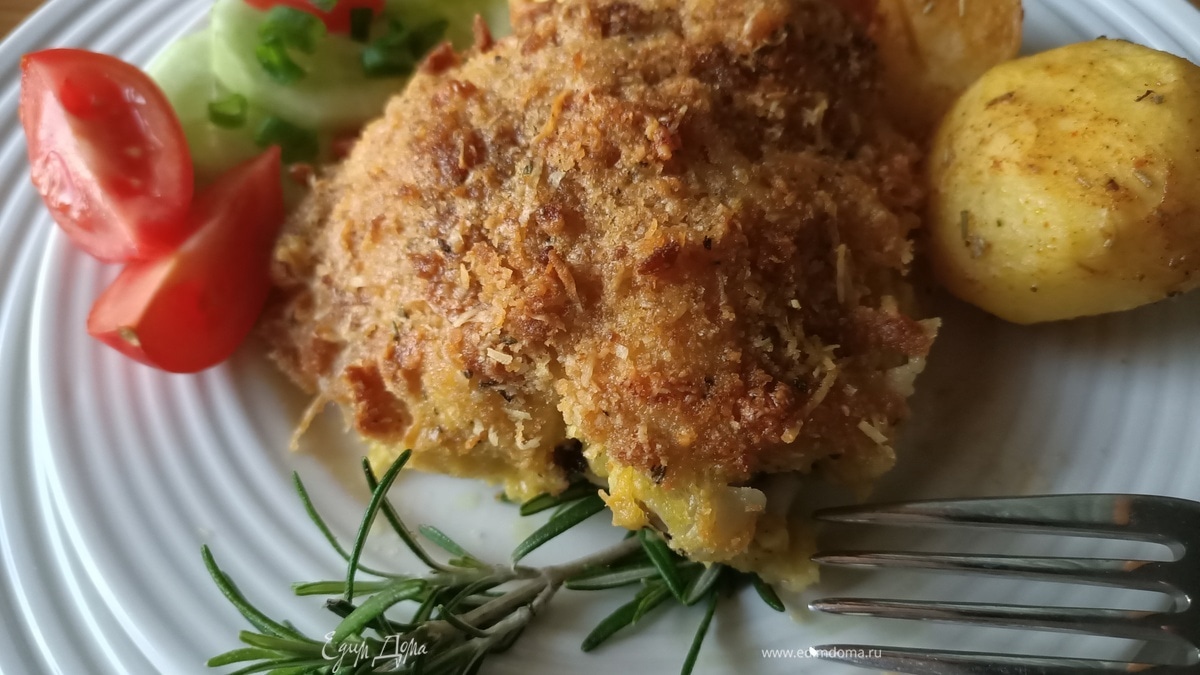 сырной панировке. Чтобы панировка лучше прилипала, убедитесь, что куриные бёдра хорошо обмакнуты в яйцо — оно будет служить «клеем».