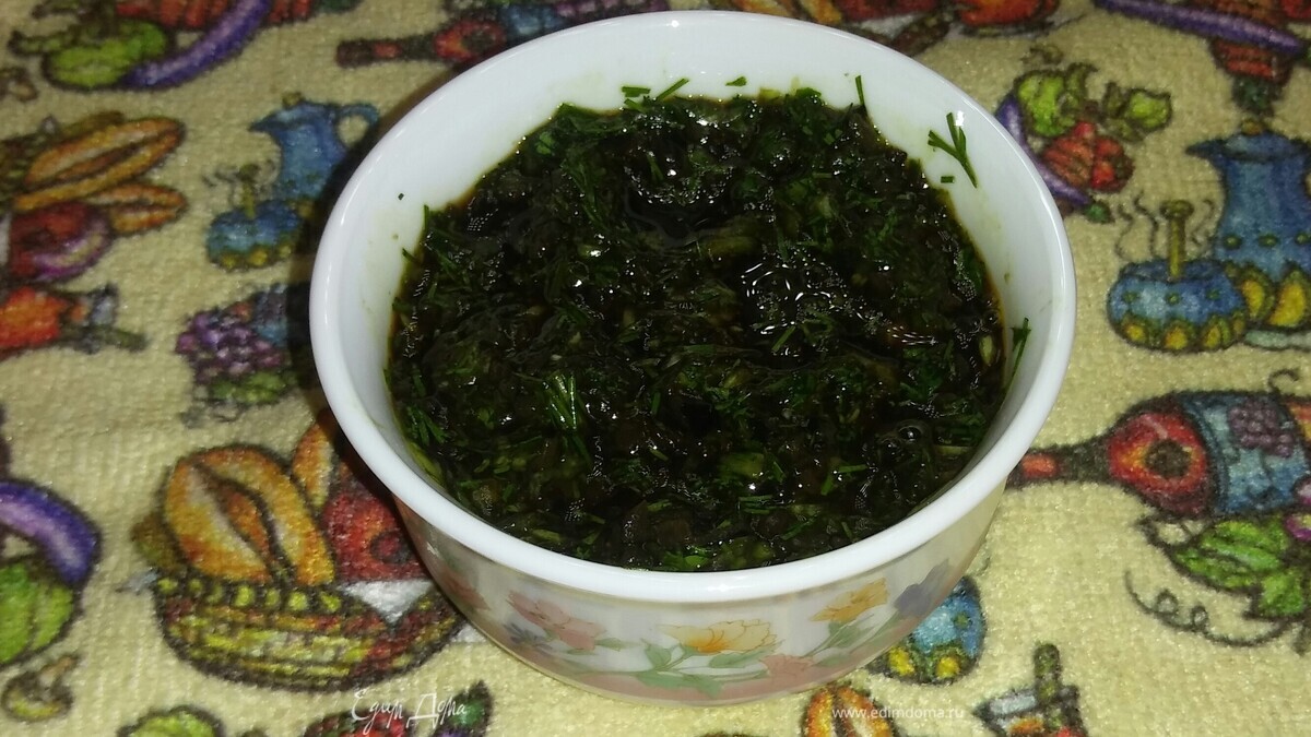 Затем выкладываем в пиалу измельченные маслины, зеленый лук, петрушку и укроп и добавляем соевый соус. Все перемешиваем. Ставим на 5 минут в холодильник. Соус готов. Приятного аппетита!