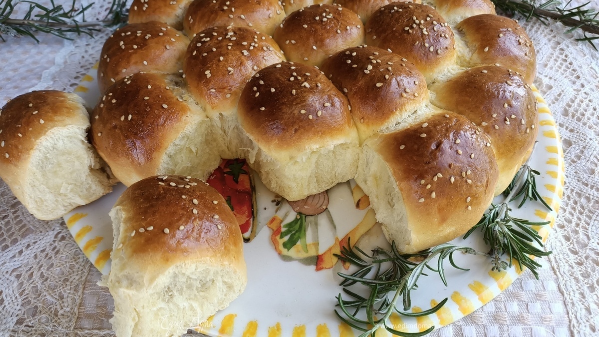 Выложить получившиеся шарики в форму швом вниз. Один — в центре, остальные — по кругу. Накрыть пищевой пленкой и дать подняться в течение 20–30 минут. - Шаг 10
