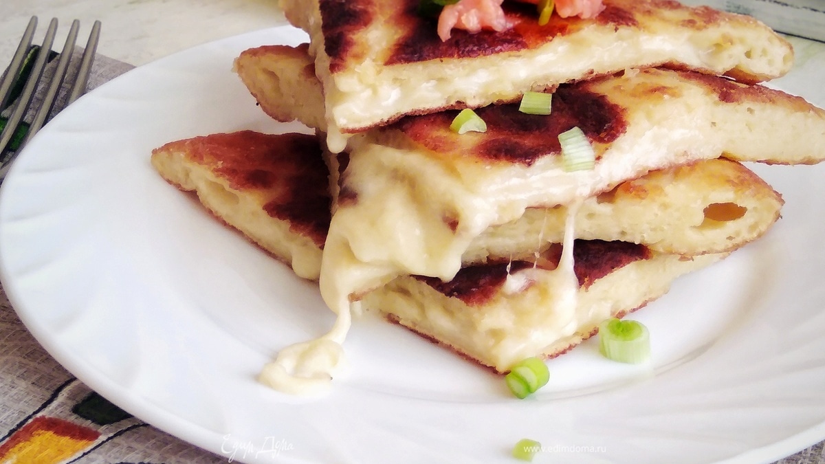 Моцареллу нарезать пластинками. Каждую часть теста раскатать в лепешку, не сильно тонко. Положить сыр, завернуть и защипнуть края. - Шаг 4