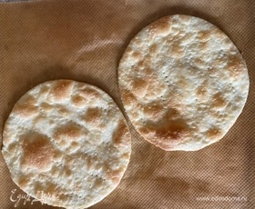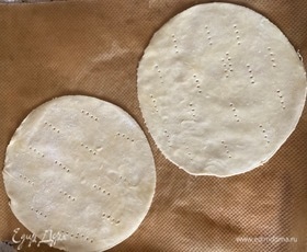 Достаем по одному шарику, тонко раскатываем, тарелкой вырезаем круг (диаметр — 20 см), делаем вилкой частые наколы и отправляем в разогретую до 200°C духовку. Я выпекала сразу по два коржа.