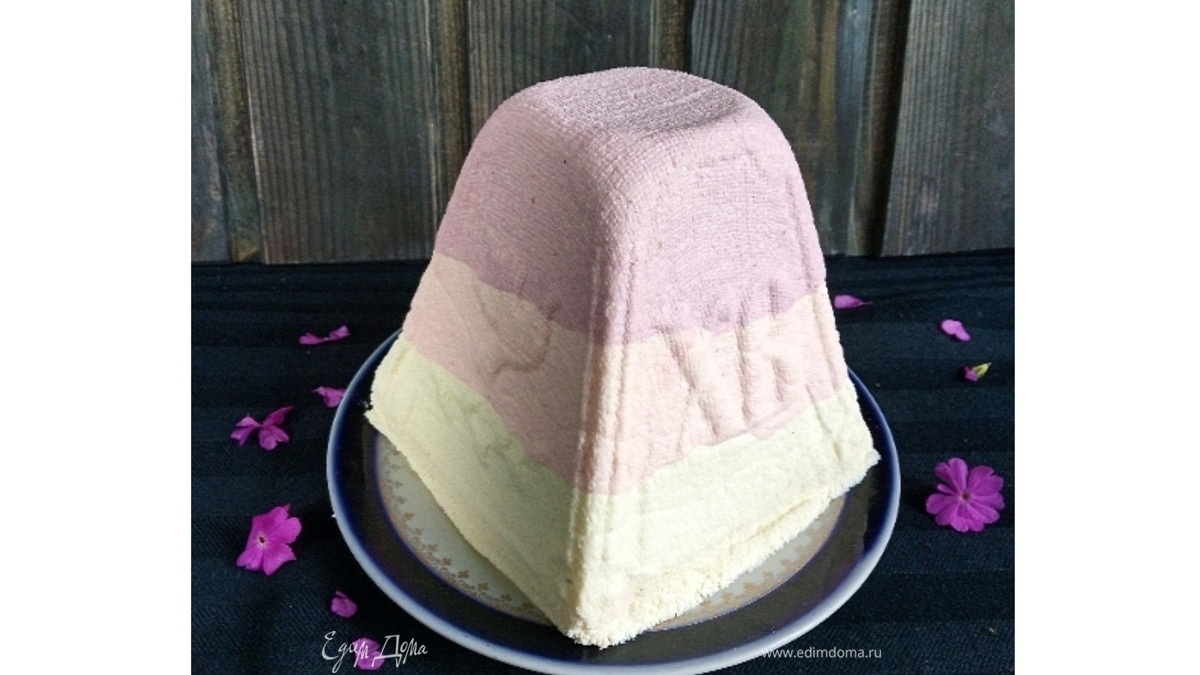 Творог протереть через сито. Охлажденные сливки взбить миксером до загустения, добавить сахарную пудру, ванилин и творожный сыр. Снова взбить. Соединить с творогом, перемешать. Разделить массу на три части. В первую ввести розовый краситель, во вторую — сиреневый. Форму выстелить двухслойной марлей, выложить поочередно сиреневый, розовый и белый слои. Поставить под гнет, поместить в холодильник на 10–12 часов.