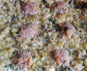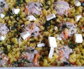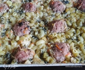 Залить одним литром молока. Накрыть форму фольгой. Поставить в заранее разогретую до 200°C духовку на 30–40 минут. Ориентируйтесь по макаронам.