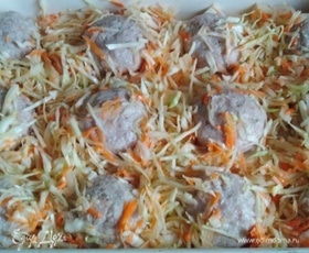 Из фарша сформировать котлеты. Выложить в форму для запекания. Между котлетами распределить овощи.