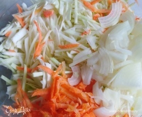 Капусту нашинковать, соединить с натертой морковью и нарезанным репчатым луком. Посолить. Немного помять руками.