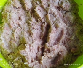 Через мясорубку пропустить свинину с репчатым луком и размоченным в молоке белым хлебом. Добавить соль, перец, остатки молока, в котором размачивали хлеб. Хорошо перемешать и выбить фарш.
