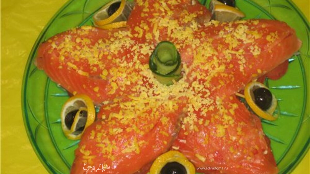 - ПодготовкаСыр и яйца натираем на терке, маслины (огурчики) и креветки режем небольшими кусочками. Готовим соус: сметана и майонез в равных частях, немного лимонного сока, соль по вкусу. Смешиваем сыр, яйца, креветки,маслины с соусом, выкладываем ложкой на блюдо в виде звезды. Придаем ложкой максимально идеальную форму. Помидор нарезаем тонюсенькими ломтиками, лучше сделать это на шинковке, и выкладываем на салат.