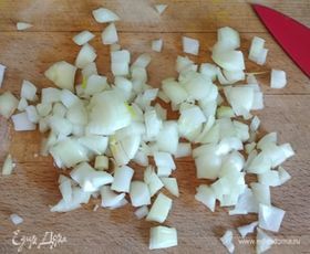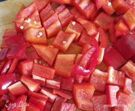 Тем временем мелко нашинковать лук, болгарский перец нарезать крупным кубиком, удалив предварительно семена и перегородки. Перец чили мелко нарезать.