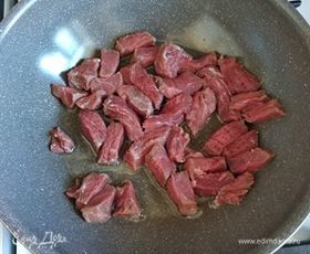 Говядину промыть, обсушить, нарезать нетолстыми ломтями, отбить и каждый ломоть нарезать на небольшие брусочки. На растительном масле обжарить мясо до золотистой корочки. Затем влить полстакана воды и тушить минут двадцать.