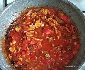 Сытное острое простое блюдо по мотивам мексиканского чили кон карне. Я взяла консервированную белую фасоль в томатном соусе. Можно взять без соуса, все равно добавляется томатная паста. Из грибов у меня были маринованные шампиньоны, но подойдут также и любые другие.