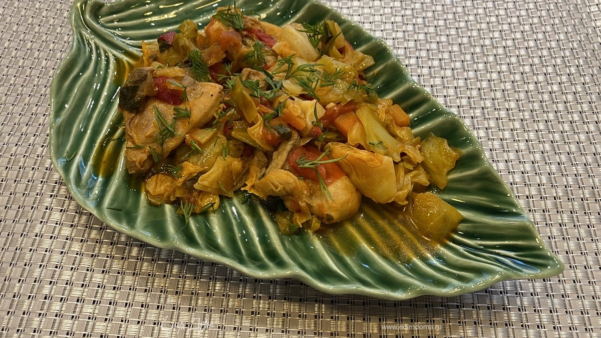 В кастрюлю с толстым дном наливаем немножко оливкового масл , выкладываем капусту, добавляем курицу и потушенные с томатной пастой лук и морковь. - Шаг 5
