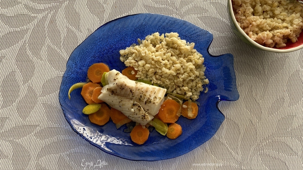 Отвариваем булгур. Раскладываем по тарелкам. Достаем из духовки треску. Также перекладываем овощи и рыбу на тарелки. Ужин готов. Приятного аппетита!