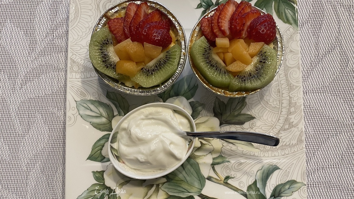 Достаем из духовки зарумяненные мини-запеканки. Украшаем сверху фруктами. На фотографии представлены клубника, киви и мушмула. Можно воспользоваться и другими яркими фруктами.