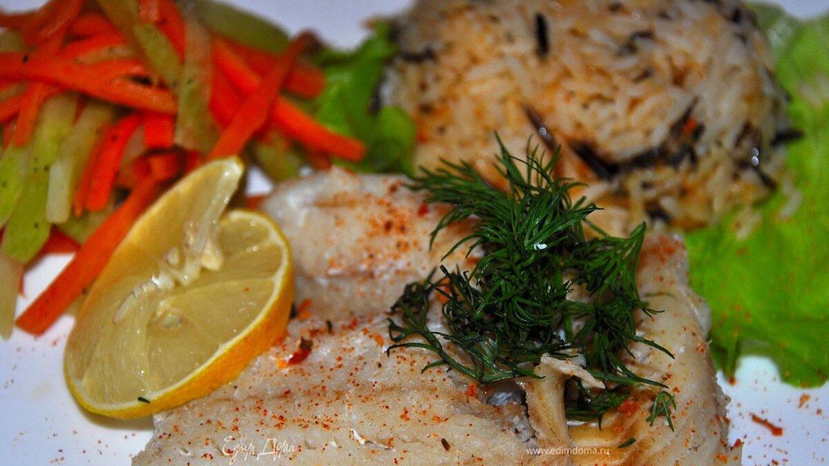 Собираем блюдо. На большую тарелку положить салатный лист, на него выложить формованный в кружке рис. Рядом выложить филе, посыпать паприкой и украсить веточкой укропа, слегка сбрызнуть оливковым маслом. С другой стороны положить горку бланшированных овощей.