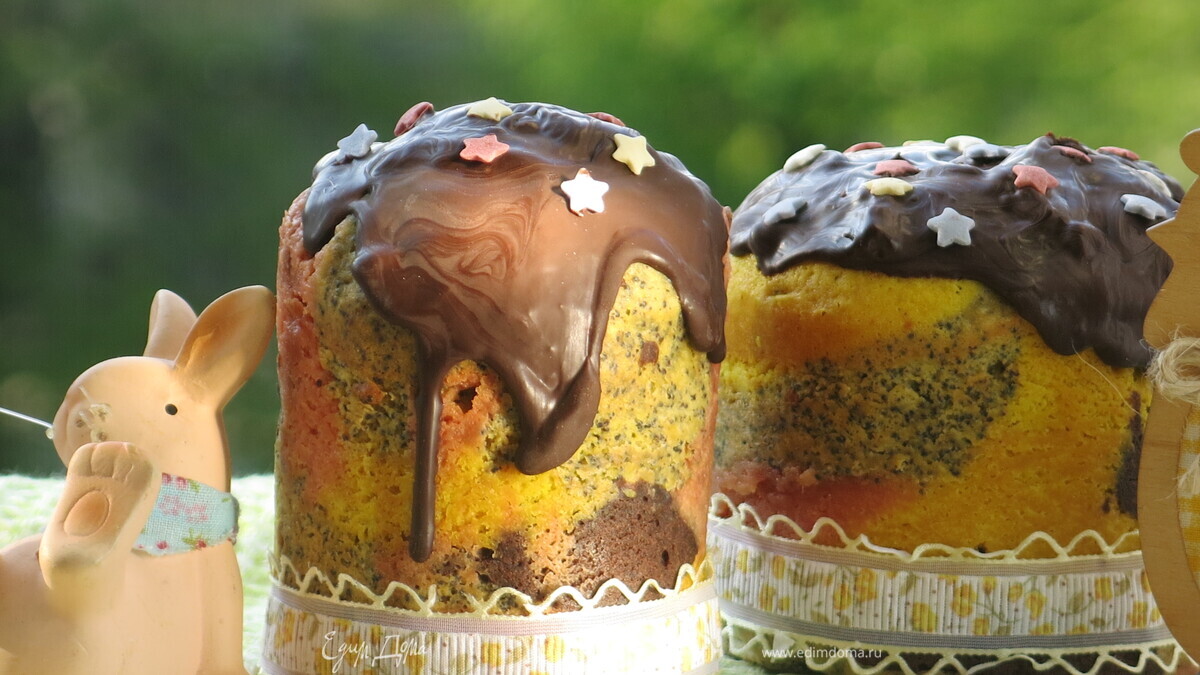 Кулич из цветного теста — с маковой, шоколадной добавками, кислинкой киселя и куркумы. Тесто без дрожжей. Приятного аппетита!