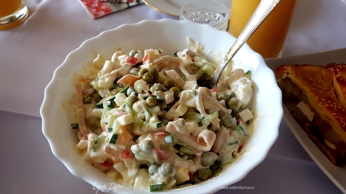 Салат с кальмарами, огурцами и горошком