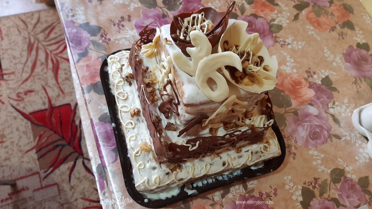 Готовые коржи сложить друг на друга и ровно обрезать края с помощью ножа. Промазать коржи кремом и сложить один на другой, последний верхний корж также обмазать кремом, бока торта — тоже. Украсить толчеными грецкими орехами. - Шаг 6На этот торт, что на фото, я замес умножила на 2, так как торт делала на день рождения, и он был в три яруса.