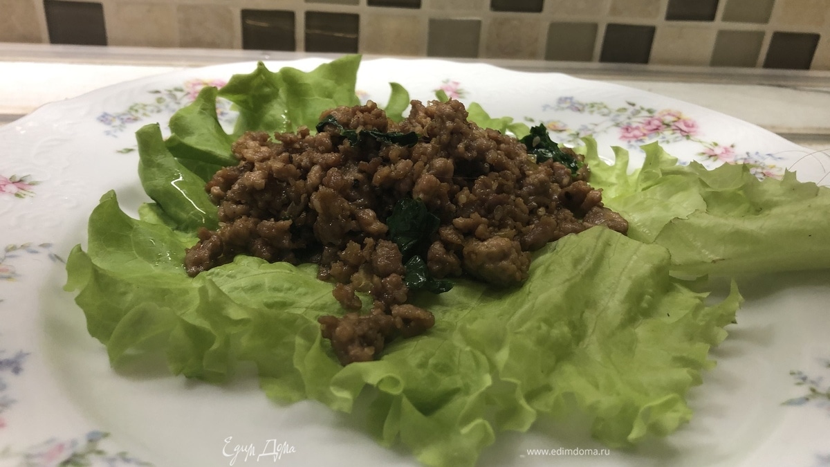 — фарш. Подаем теплым. Приятного аппетита. Салат айсберг должен быть хрустящим — не давайте ему долго стоять с фаршем, чтобы листья не потеряли свежесть.