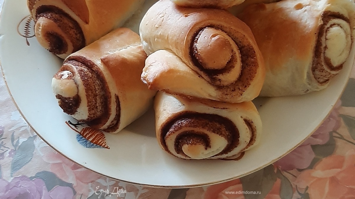 - Шаг 3Далее, когда тесто подошло, я разделяю его на 2 части. Каждую раскатываю, в серединку сыплю сахар и корицу и равномерно распределяю по всей поверхности, скручиваю рулетом, защипываю края. Нарезаю под углом. Выходит примерно 10–12 булочек. И кладу на противень, смазанный растительным маслом. Смазываю поверхность яйцом и оставляю на расстойку минут на 30. Булочки должны увеличиться в объеме.