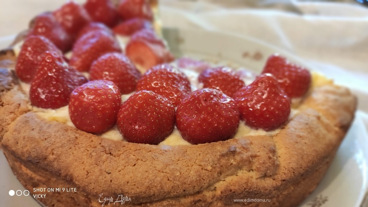 Сегодняшняя выпечка у меня с клубникой. Вначале выпекается очень вместительный корж-лукошко. Затем он заполняется ванильным кремом на основе пудинга. Сверху выкладывается ягода. У меня клубника, но можно использовать любую, даже микс из ягод. По желанию можно посыпать пирог сахарной пудрой.
