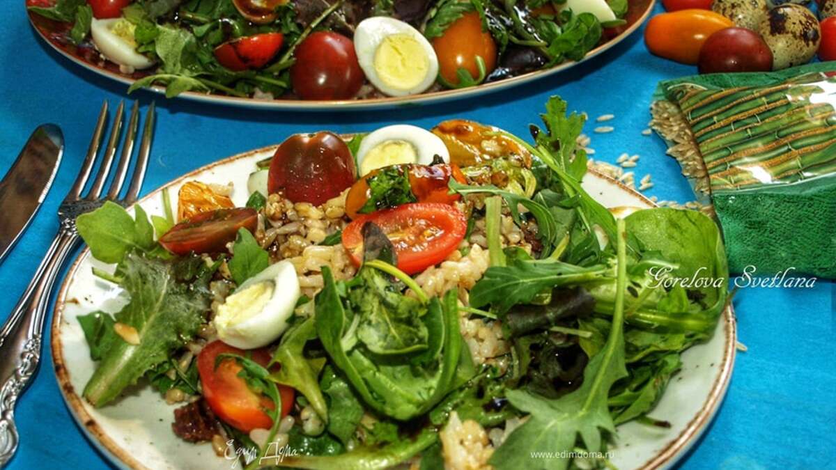 Полезный и вкусный салат из бурого риса. Полноценный обед для людей, следящих за своим питанием и здоровьем. Бурый рис богат клетчаткой и рядом других биологически активных веществ. Имеет небольшой гликемический индекс.