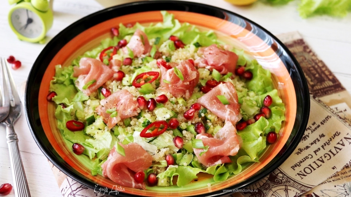 1Надюша, забрала рецепт в КК. Огурец придает свежесть, киноа и мясная нарезка сытность. Гранат не только украшает, но и дополняет вкусовую палитру салата. Люблю эту крупу, правда, цена кусается.