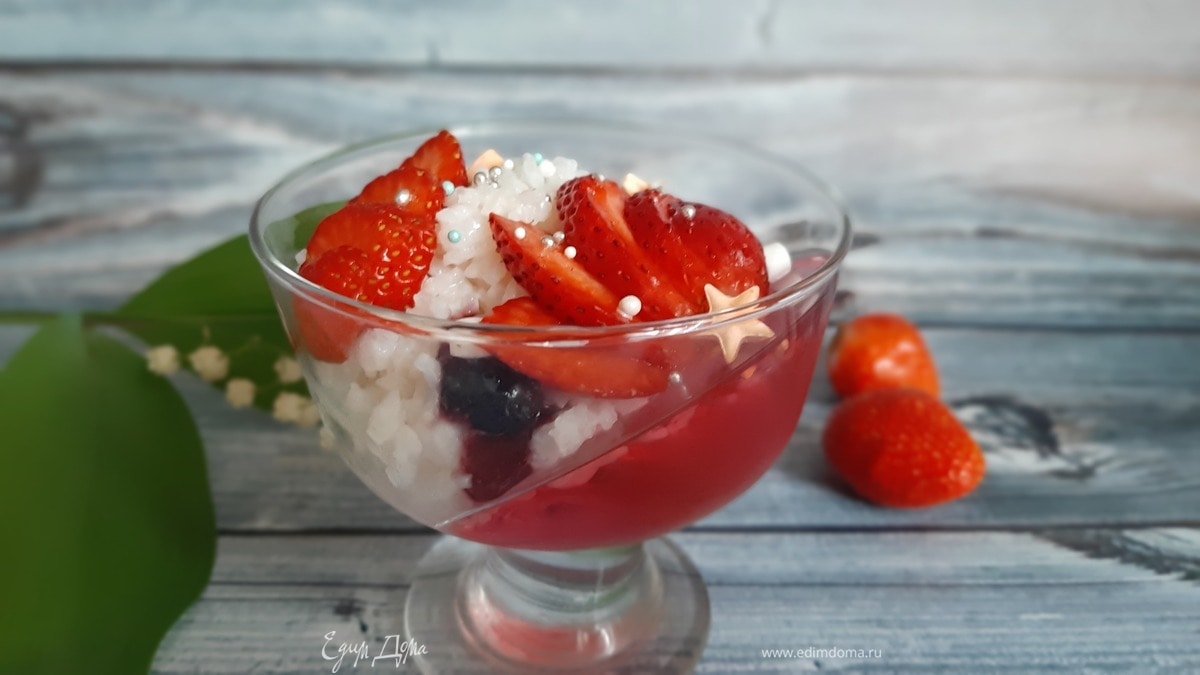 Выложила рис на желе, добавила пару капель джема и клубнику. И вот нелюбимая каша с любимым желе оказались съедены ребенком очень быстро!