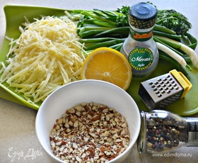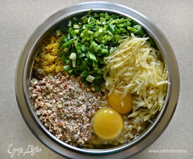 Сыр (любой твердый на ваш вкус) натрите на терке, 1/3 отложите для посыпки запеканки. Миндаль измельчите в мелкую крошку, зеленый лук и петрушку нарежьте, натрите мелко цедру половины лимона.