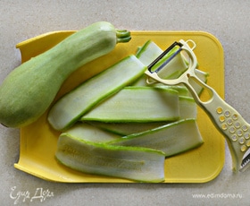 Молодой кабачок (или цукини) нарежьте вдоль с помощью овощечистки тонкими слайсами.