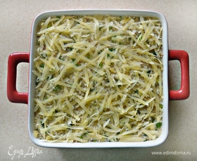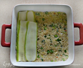 Форму для запекания (небольшую, но достаточно глубокую) смажьте оливковым маслом, можно также немного посыпать дно и бортики формы манной крупой. Выложите половину смеси с киноа в форму, разровняйте, слегка утрамбовывая. Сверху уложите пластины нарезанных кабачков, получится пару слоев внахлест. И далее — оставшуюся смесь из киноа, также разравнивая поверхность и утрамбовывая.