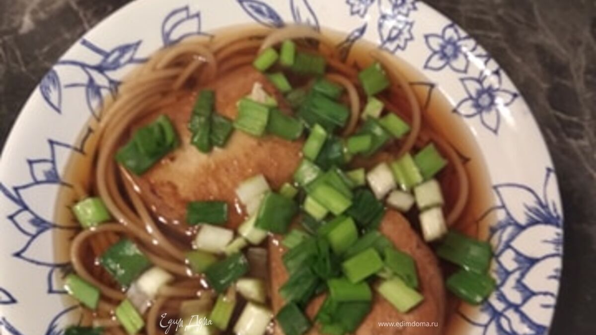 В миску кладем лапшу, сверху — тофу, заливаем бульоном из шага 5, сверху посыпаем нашинкованным зеленым луком. Легкое, вкусное и оригинальное блюдо готово. Приятного аппетита!