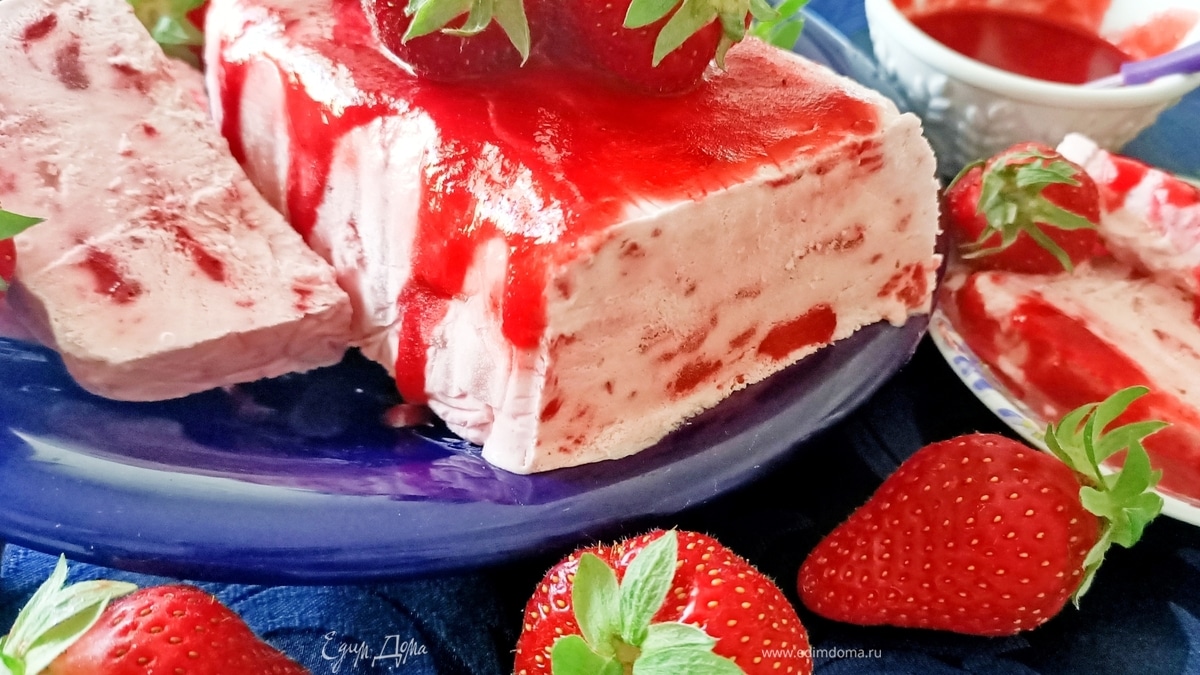 Готовим клубничный соус. Клубнику измельчить при помощи блендера, добавить сахарную пудру и лимонный сок, варить 2–3 минуты. Остудить. Семифредо достать из морозильной камеры, полить соусом, разрезать на порционные кусочки, украсить свежей клубникой и подавать. Приятного аппетита!