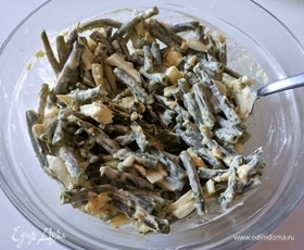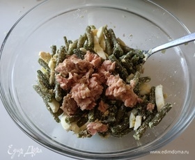 Стручковую фасоль разделить на две части. В одну добавить тунца, поперчить, посолить и заправить оливковым маслом.