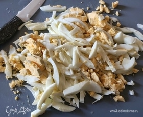 Отварить яйца в течение 10 минут, очистить их и нарезать соломкой.