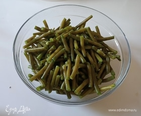 Стручковую фасоль опустить в кипящую воду с добавлением щепотки соли. Варить 6 минут, после чего откинуть на дуршлаг и промыть под проточной водой.