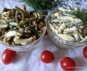 Два варианта приготовления очень простого и быстрого салата с зеленой стручковой фасолью. Один заправлен оливковым маслом, второй — майонезом.
