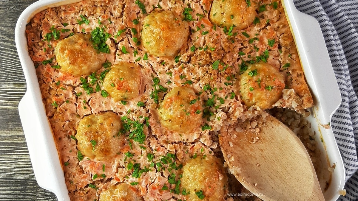 В фарш добавляем измельченный репчатый лук, соль и перец. Формируем шарики и выкладываем на гречку. Убираем в прогретую до 180°C духовку примерно на 20–25 минут. - Шаг 3