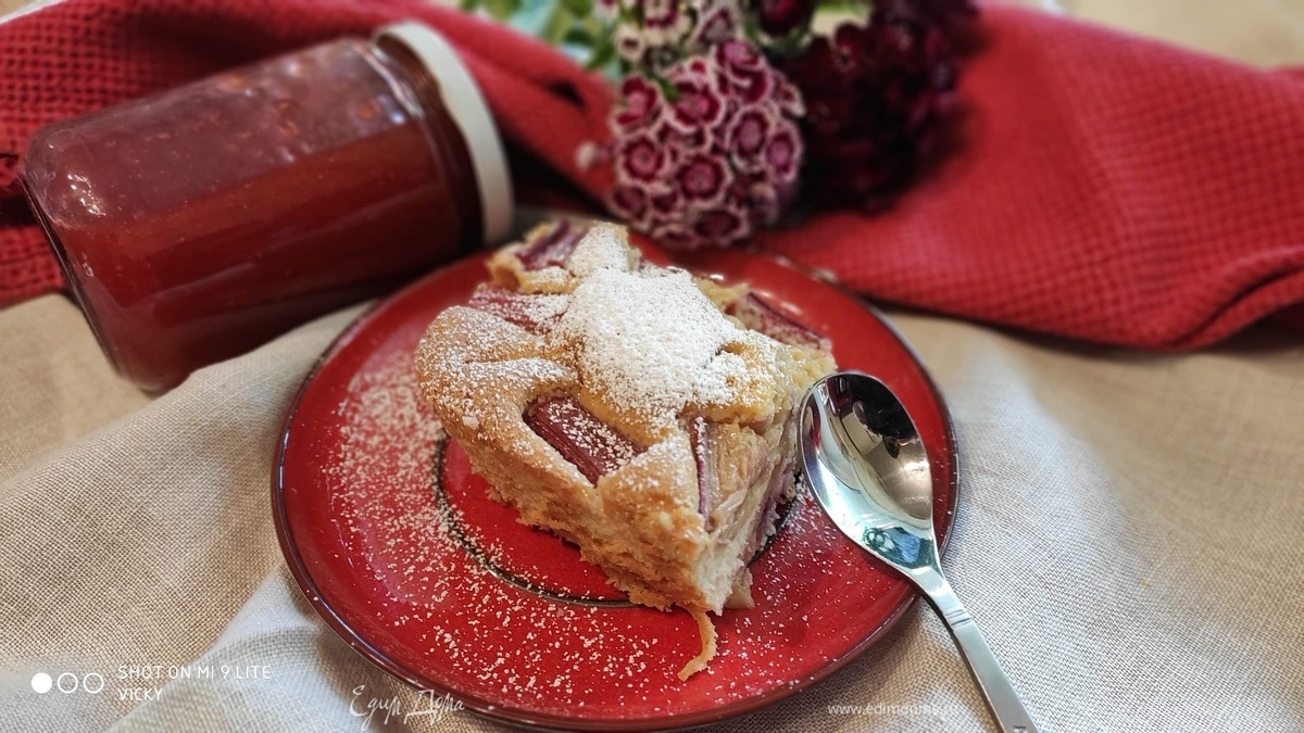 Выложить остальную часть ревеня. Выпекать в духовке, предварительно разогретой до 150°C, в течение примерно 35 минут и подавать, посыпав сахарной пудрой. - Шаг 7
