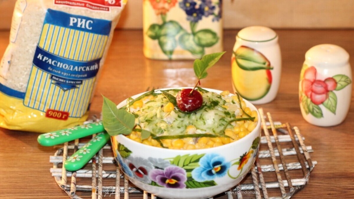 Выложить готовый салат в салатник и красиво оформить. Для оформления у меня огурец и кукуруза. - Шаг 9