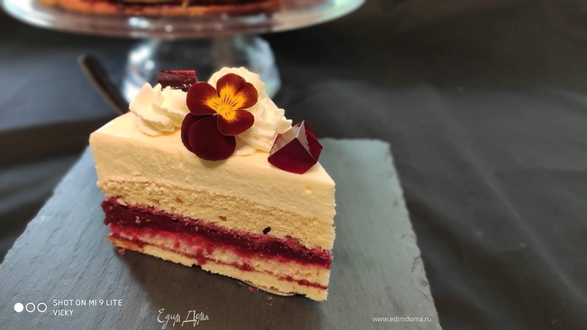 Для декора взбить сливки с ванильным сахаром и отсадить розочки с помощью кулинарного мешка. Острым ножом вырезать кубики из вишневого желе и распределить их между сливочными розочками. Можно использовать листики мяты или цветочки. - Шаг 9