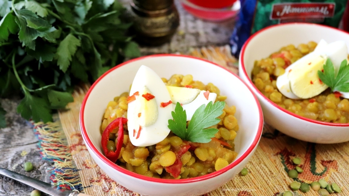 Зеленый горох варится до готовности около часа. Поэтому через 20–30 минут, с момента кипения гороха, к нему добавить картофельное пюре, овощную заправку и специи. Посолить по вкусу. Добавьте горячей воды, если нужно, так как горох вптывает в себя воду. Чотпоти — это что-то среднее между густым супом или жидкой кашей. - Шаг 6