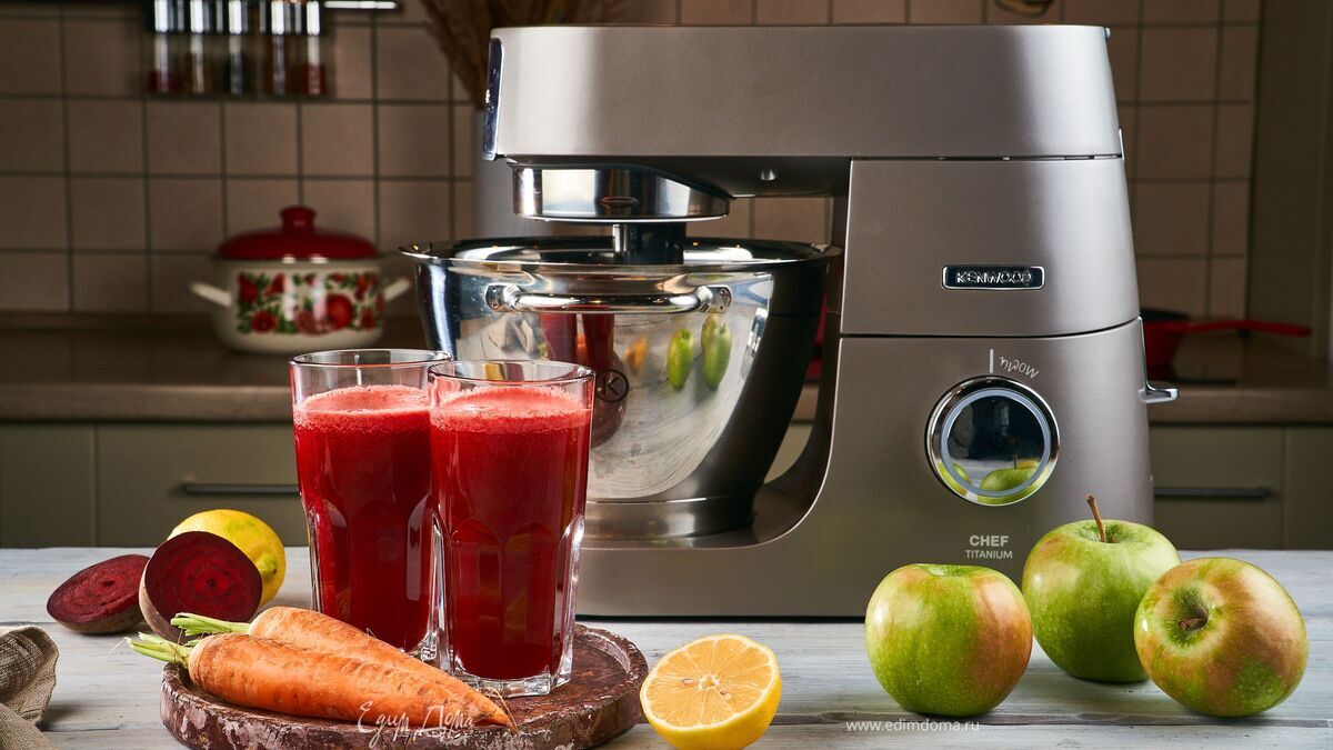 Установите на кухонную машину KENWOOD насадку-соковыжималку и выдавите сок из моркови, свеклы и яблок.