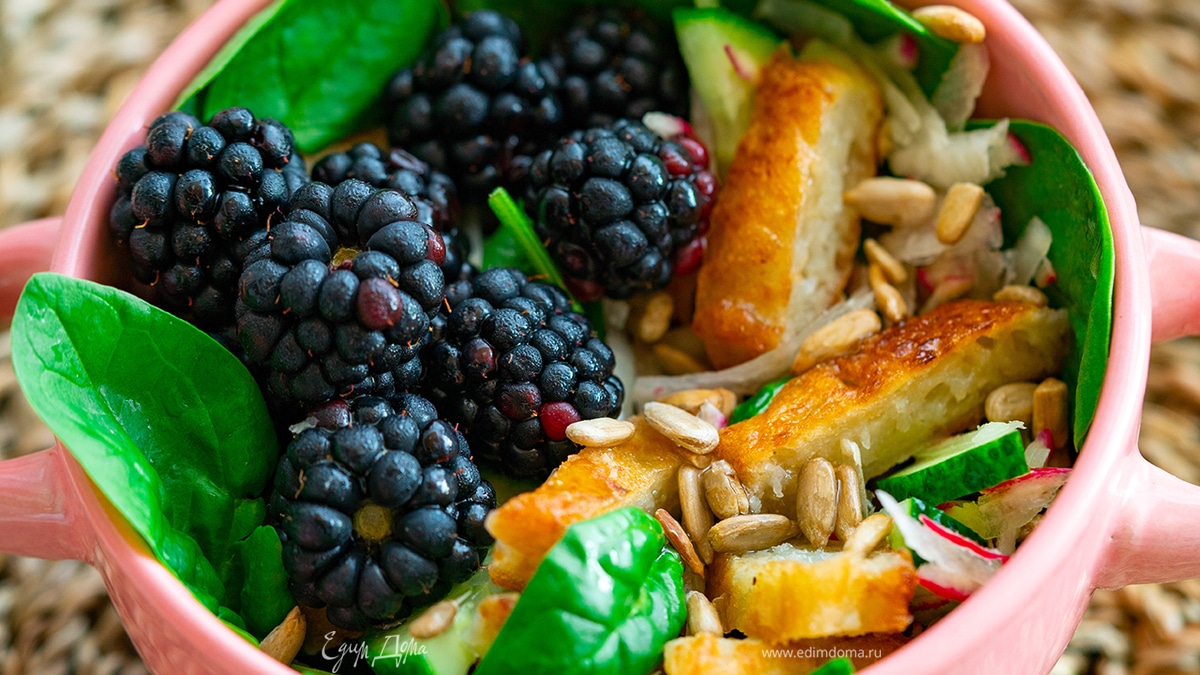 Сверху положите ежевику и семена подсолнечника.