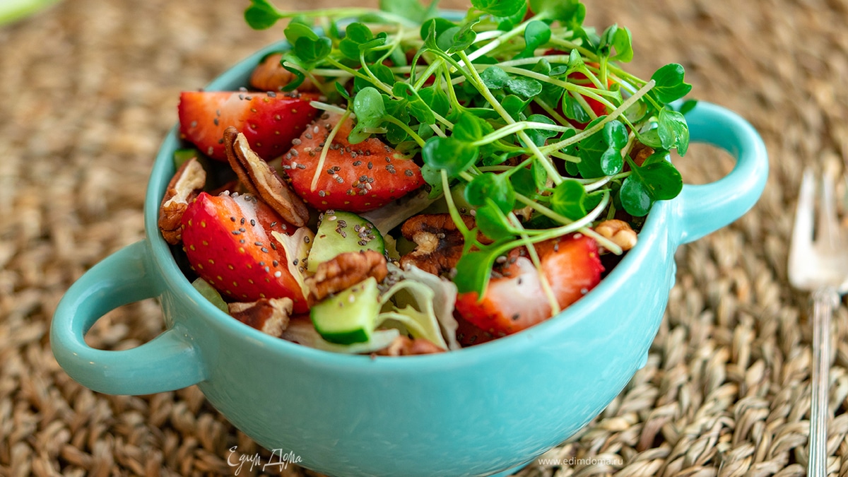 Добавьте орехи пекан и проростки редиса. Салат с летним настроением готов!