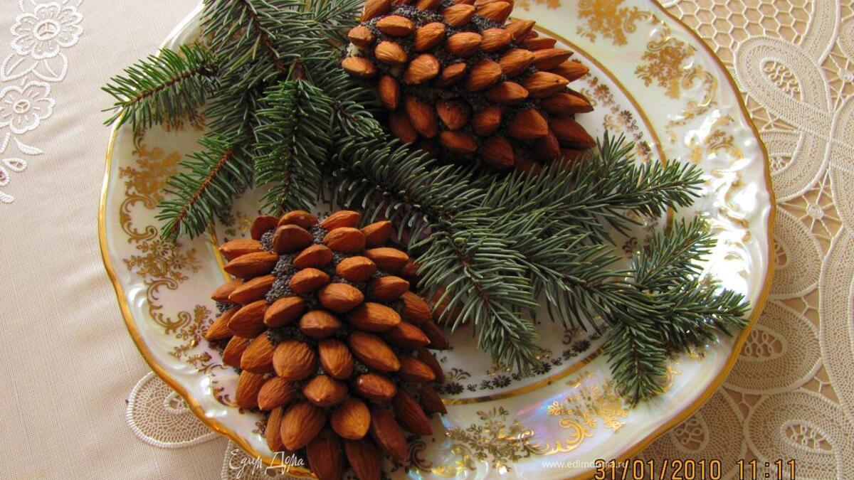 - Шаг 1Из картофельного пюре сделать лепешку, на нее – мелко порезанную куриную грудку с грибами. Придать форму шишки. Иголки – орех миндаля .Слегка посыпать маком.