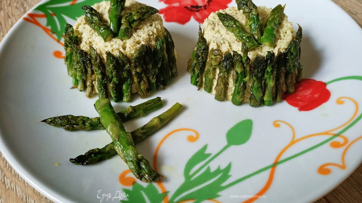 Верхушки спаржи обжарить в небольшом количестве масла до готовности. Отложить в сторону, они нам понадобятся для украшения мусса. - Шаг 3