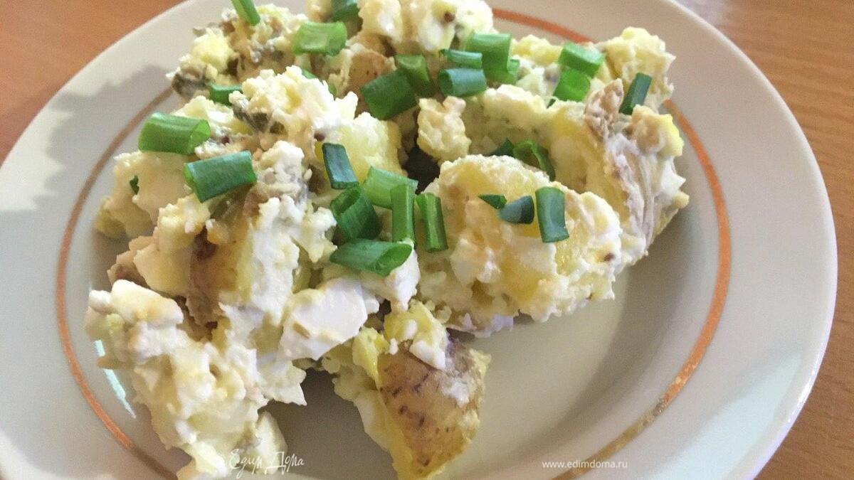 Добавляем нарезанный картофель к яйцам и заправке, перемешиваем. Лучше всего поставить салат в холодильник настояться и пропитаться заправкой на несколько часов, идеально — на ночь. При подаче украсить свежей зеленью.