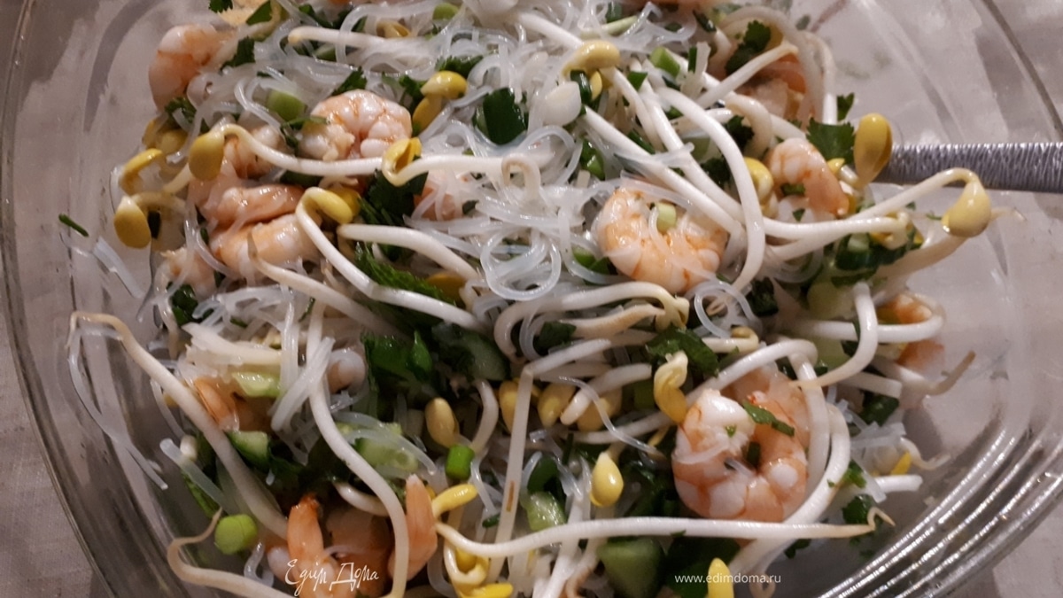 - Шаг 1Отварите вермишель, обжарьте креветки, нарежьте огурцы (малосольные или свежие), кинзу и чесночные стрелки, нарвите листья салата, мяту и тайский базилик.