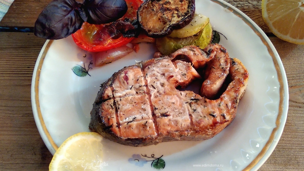 Переложить рыбу на решетку и жарить на мангале до готовности. У меня было готово через 15 минут. Готовую рыбу еще раз сбрызнуть лимоном. Подавать с любым гарниром. Мы ели с салатом из запеченных овощей и трав.
